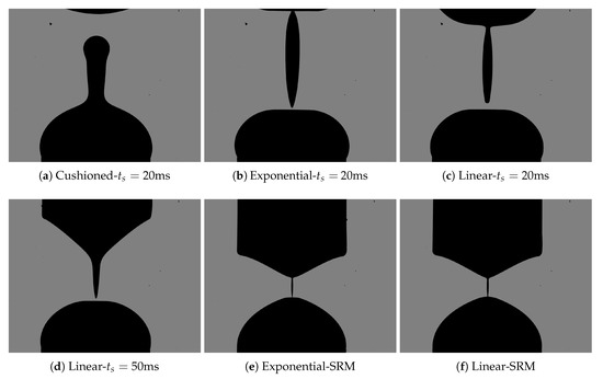 Due to the low shear viscosity of the ferrofluid samples used in this study, which was smaller than 10 mPas (Table 1), according to Rodd et al. [26], the characterization of the extensional properties in the CaBER device is affected by inertial effects due to the fast step strain of the conventional technique, which introduces oscillations in the liquid that result in a loss of symmetry in the filament. (Figure 4a–d). Campo-Deanõ and Clasen [27] developed the so-called slow retraction method (SRM), which consists of recording the filament thinning process with a high-speed camera while the filament thinning process is promoted by a continuous and slow extension of the liquid bridge; in this way, the breaking process is orders of magnitude faster than the separation speed of the plates. By using the SRM, the effect of inertia due to quick plate separation in low-viscosity samples is minimized, as it can be seen in Figure 4e–f, where the oscillations in the last droplets were strongly reduced and the filament maintains its full symmetry up to the point of final breakage compared. Furthermore, it can be observed that SRM is independent of the CaBER stretching profile, as long as the separation rate of the plates remains much slower than the filament thinning process.