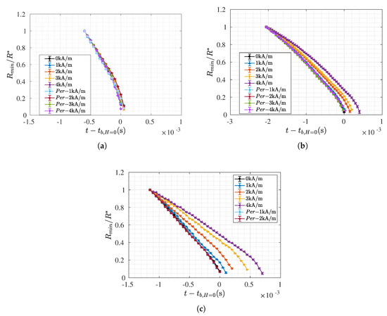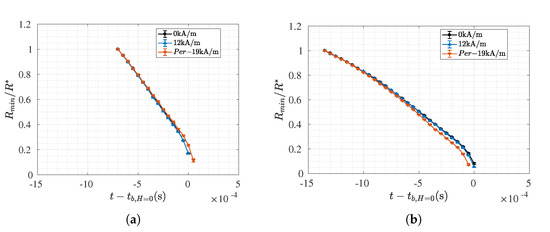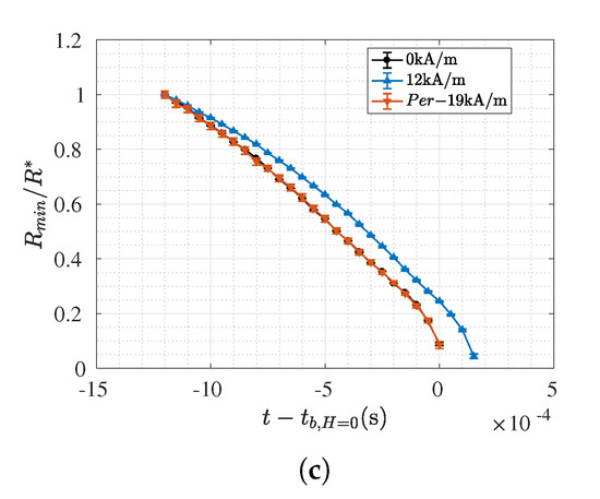 Figure 5a–c, shows the temporal evolution of the last stages of the minimum filament radius, normalised with , corresponding to the oil-based ferrofluids for the different intensities and orientation of the external magnetic field. The abscissas of the plots represent the time of the filament thinning minus the break-up time corresponding to the ferrofluid sample without the application of an external magnetic field ()