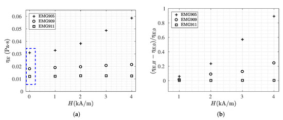 Figure 6a shows the dependence of the extensional viscosity with the intensity of the external magnetic field applied parallel to the direction of the flow. As expected, the Trouton ratio for Newtonian fluids () is respected at 0 kA/m. The larger the concentration of the particles and magnetization of the particles in the direction parallel to the extensional flow leads to a higher field-induced viscosity (see Figure 6a) and, consequently, the filament last longer, as discussed above (Figure 5a–c).