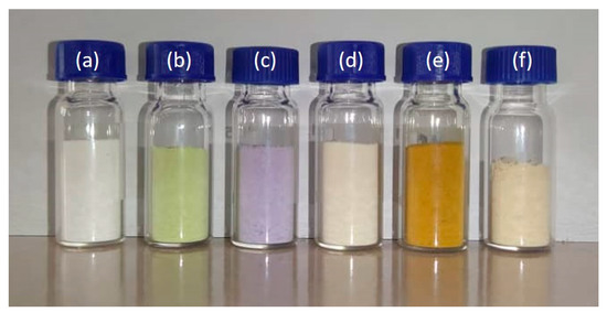 Physical appearance of (a) SAPO-5, (b) CuCl×/SAPO-5, (c) CoCl×/SAPO-5, (d) SnCl×/SAPO-5, (e) FeCl×/SAPO-5 and (f) ZnCl×/SAPO-5.