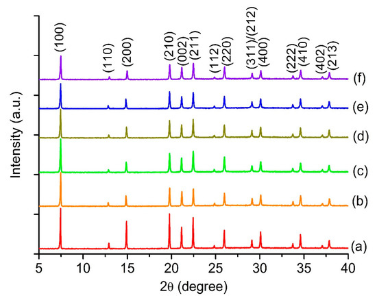 XRD patterns of (a) pristine SAPO-5, (b) CuClx/SAPO-5, (c) CoClx/SAPO-5, (d) SnClx/SAPO-5, (e) FeClx/SAPO-5 and (f) ZnClx/SAPO-5.