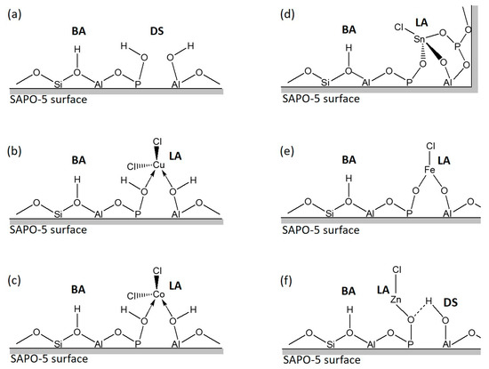 The possible structures of MClx/SAPO-5 are shown in Figure 4 after spectroscopy investigations are considered. For CoClx/SAPO-5 and CuClx/SAPO-5, the metal chloride molecules are bound to the surface of SAPO-5 via dative bondings where these bonds are not as strong as covalent bondings (Figure 4b,c). In contrast, the metal chloride molecules are covalently bound to the surface of SAPO-5 in SnClx/SAPO-5, FeClx/SAPO-5 and ZnClx/SAPO-5, where the Cl atom(s) of the respective metal chloride is/are condensed together with the O‒H group of the SAPO-5 defect sites (Figure 4d–f).