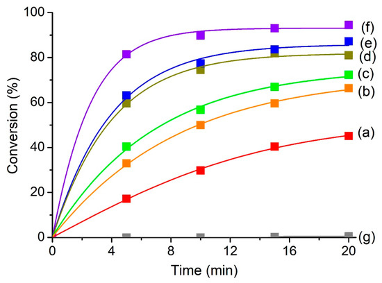 Acylation of 2-methylfuran catalyzed by (a) SAPO-5, (b) CuClx/SAPO-5, (c) CoClx/SAPO-5, (d) SnClx/SAPO-5, (e) FeClx/SAPO-5 and (f) ZnClx/SAPO-5 at 110 °C. Reaction conditions: Catalyst = 0.20 g, 2-methylfuran = 4.7 mmol, acetic anhydride = 14.1 mmol, solvent-free. The reaction without adding any catalyst is shown in (g).