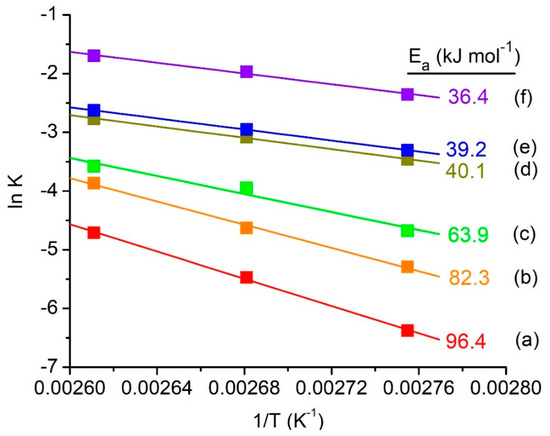 The Arrhenius linear plots and activation energies (Ea) of acylation of 2-methylfuran catalyzed by (a) pristine SAPO-5, (b) CuClx/SAPO-5, (c) CoClx/SAPO-5, (d) SnClx/SAPO-5, (e) FeClx/SAPO-5 and (f) ZnClx/SAPO-5. Reaction conditions: Catalyst = 0.20 g, 2-methylfuran = 4.7 mmol, acetic anhydride = 14.1 mmol, reaction temperature: 90, 100 and 110 °C, time = 0–20 min, solvent-free.