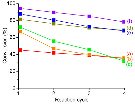 Reusability test of (a) SAPO-5, (b) CuClx/SAPO-5, (c) CoClx/SAPO-5, (d) SnClx/SAPO-5, (e) FeClx/SAPO-5 and (f) ZnClx/SAPO-5 for consecutive five reaction cycles. Reaction conditions: temperature = 110 °C, time = 20 min, 2-methylfuran = 4.7 mmol, acetic anhydride = 14.1 mmol, catalyst = 0.20 g MClx/SAPO-5.