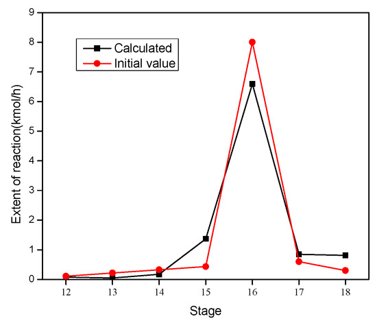 Reaction extent: The reaction extent calculated by the chemical reaction equilibrium was taken as the maximum value of the reaction extent in the reaction section. According to the feeding condition of the reaction section, the position with the maximum reaction extent was selected. If there was only one feed in the reaction section, the position of the feed stage was selected. If there were multiple feeds in the reaction section, the position of the feed stage near the reboiler was chosen. If there was no feed in the reaction section, the position of the reaction stage closest to the feed was selected. The initial value of the reaction extent of the other stages were calculated according to the maximum value and a certain proportion of attenuation. The calculation is shown below.