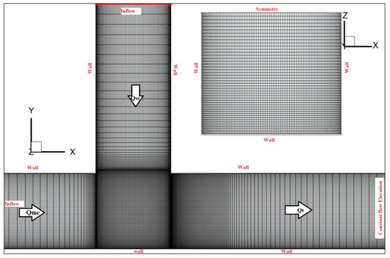 In this study, a structured non-uniform block of mesh was used to simulate the main and side channels. The meshes were more intense in the vicinity of the confluence to increase the accuracy of computations. Boundary conditions included inflow discharge for the main channel and the lateral channel entrance, constant level outflow for the main channel outlet, wall for bed and the right boundaries of the main channel, and symmetry for the top border. Other required wall conditions were produced using solid components. Given that using a single mesh domain caused two large empty domains at the sides of the lateral channel, these parts were eliminated from calculations using void or space components. Considering restrictions in the available processing power, the main mesh block was non-uniformly identified in order to increase the accuracy at the vicinity of the junction and reducing the number of mesh cells in less important areas. Considering the limitations in processing power (Core i7 CPU-turbo speed of up to 4.0 GHz), a trial and error process was performed to find a proper balance between the consumed simulation time and the resulted accuracy of the simulations. Different mesh sizes were tested; however, a severe increase in computational time—due to decreased mesh sizes—as well as the increased number of cells, restricted the use of meshes with side dimensions less than 4 mm. Thus, a mesh domain, with 17 m length, 0.6 m width, and 0.4 m height and consisting of 2,524,480 cells, was opted to simulate the channels. The mesh domain was composed of 320 cells in the x-direction, 161 in the y-direction, and 49 cells in the z-direction. Neglecting the void spaces, all active cells were 1,839,166. As mentioned above, the cell sizes were reduced near the walls and bed to 4 mm. Besides, the same cell size was identified at the corners of the junction and the space of flow mixing in order to increase the accuracy of the calculations. The plan and side view of the mesh domain, as well as the boundary conditions, are plotted in Figure 1.