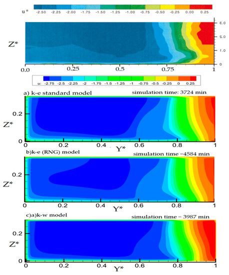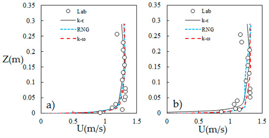 A comparison of the accuracy of velocity calculations from different turbulence models in estimating U-component of velocity at x = 8.82 (x* = 2 Wc) and (a) y = 0.25 Wc, and (b) y = 0.5 Wc.