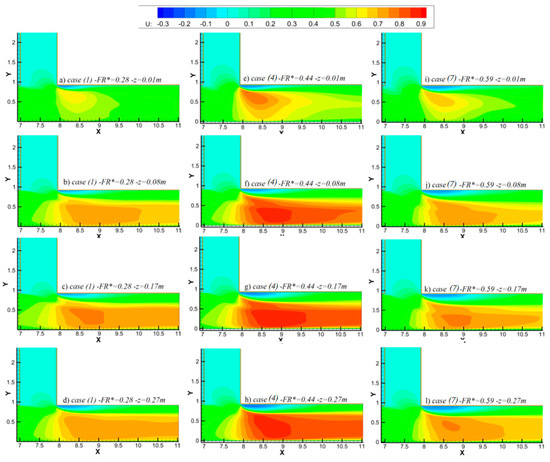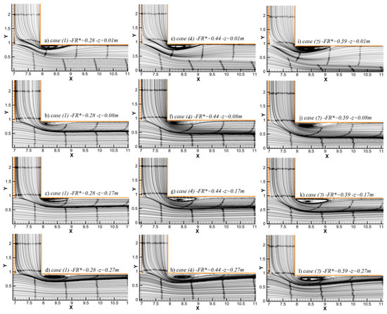 The effect of Fr* on the flow pattern at different elevations for (a–d) case 1 and (e–h) case 4, and (i–l) case 7.