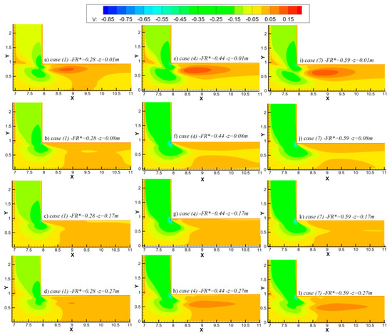 The distribution of the stream-wise component of velocity (U) and the normal component of velocity (V) at x-y plane around the confluence structure and along the main channel are presented in Figure 4 and Figure 5, respectively, for three different cases, including case (1) with Fr* = 0.28, case (4) with Fr* = 44, and case (7) with Fr* = 0.59. The results were presented in four different depths, including z = 0.01 m (near the bed), z = 0.08 m, z = 0.17 m, and z = 0.27, close to the water surface. The other cases were not shown here due to the similarity between results. As expected, there was a significant difference in maximum velocity between case 1 (Figure 4a–d) and case 2 (Figure 4e–h). This difference was a direct consequence of increased discharge from side-channel in case 4 compared to case 1, as well as the reduced width of the main channel after confluence due to the increase in the size of the recirculation zone, and agreed with the increased Froude number of total discharge. Unexpectedly, comparing case 1 to case 7 indicated that the velocity of flow after the confluence in case 7 was higher than that in case 1, especially near the bed and close to the surface, although the overall discharge in case (7) was less than that in case 1 (up to 7%). Besides, the high-velocity zone moved downstream. Yet, it could be seen that the velocity gradient toward the recirculation zone at the downstream corner of confluence was more intense in case (1) compared to the case (7), which was caused by increased discharge and total Froude number of the tributary inflow.