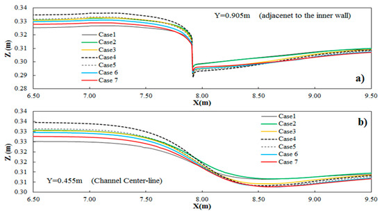 Longitudinal flow surface profiles at (a) Y = 0.905m and (b) Y = 0.455m (channel centerline).