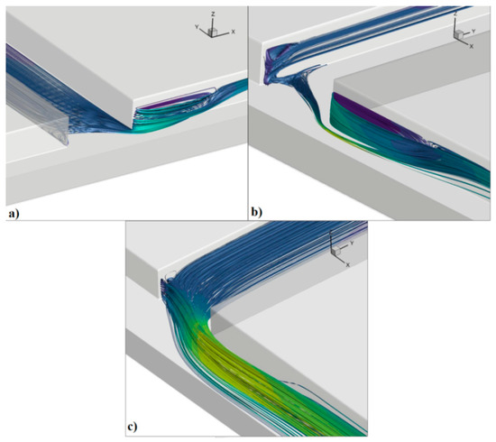 Figure 9 presents the streamlines for cases 1, 4, and 7 in the mentioned depths in the previous section. It was clear that the size of the recirculation zone at the main channel increased as the Froude ratio increased from case 1 to case 7, which was responsible for increased maximum velocity in case 7 compared to case 1 despite less discharge. The results were consistent with the findings of other researchers, such as [23] and [7]. With increasing the Froude ratio, loss of flow energy at the junction increased, as the momentum of tributary flow, which needed to be turned into the main channel flow, was increased. Consequently, higher energy drop might lead to a more significant separation zone [9]. Besides, an important dividing line starting from the upstream edge of the tributary channel was visible (where streamlines gather), which was located at different stations in different elevations of flow, indicating the section of shear flow at the mixing interface of tributary flow with the main stream.