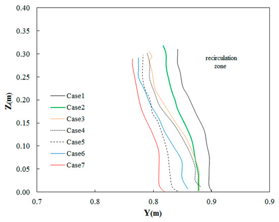 As stated, the width and length of the recirculation zone increased with increasing the Froude ratio. Figure 10 represents the cross-sectional variations of the recirculation zone in each case from the bed to the flow surface. It was indicated that the cross-sectional area of the recirculation zone increased from bed to water surface in all cases. Besides, it was shown that the overall and the width of the recirculation zone at all elevations increased with increasing the Froude ratio from case 1 to case 7.