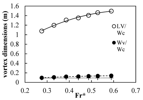 Figure 11 presents the length and width of the recirculation zone, as well as the shape index for each case and different Fr* values. It was indicated that the length and width of the recirculation area increased with different slopes, resulting in a slightly increased shape index with increasing the Fr*, which could be assumed horizontal.