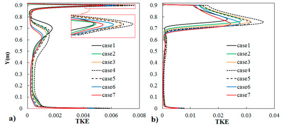 The distribution of the turbulent kinetic energy (TKE) at the transverse sections of x = 7.91 and x = 8.35 for all simulation cases are presented in Figure 12. It was indicated that a high positive gradient of TKE was formed at the downstream corner of the tributary channel. It could be seen that the maximum value of TKE was related to the case 4 with the maximum amount of total discharge and Froude number; for other cases, with decreasing the total flow discharge, the maximum values of TKE were reduced. It could be noted that the minimum value of TKE among all cases was related to case 1 and case 2. A comparison between case 1 and 2 to case 6 and 7 showed that the maximum value of TKE in cases 6 and 7 with less total discharge and higher Fr* was higher than that for cases 1 and 2, suggesting larger recirculation zones and higher ratios of turbulence despite less discharge (see Figure 12a). Considering the turbulent energy at x = 0.5 Wc downstream of the junction, a relatively similar trend with that of the previous transverse section could be observed.