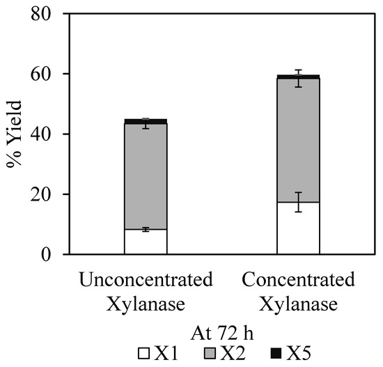 Figure 2. The yield from primary hydrolysis using alkali-pretreated EFB from either unconcentrated or concentrated XYN10Ks_480 endoxylanase produced by recombinant S. lividans 1326 in 72 h. X1, xylose; X2, xylobiose; X5, xylopentaose.