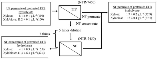 The use of commercial enzymes is costly and is one of the obstacles of lignocellulose-based biorefinery technology [16]. Therefore, it is desirable to concentrate on improving total enzymatic activity. Recently, pressure-driven membrane separation processing that uses low levels of energy consumption has been used to recover enzymes and improve subsequent fermentation efficiency [17,18]. In the food industry, membrane operations are applied in the beverage industry (wine, beer, fruit juices, etc.), the dairy industry (whey protein concentration, milk protein standardization, etc.) and, to a lesser extent, in the processing of egg products [19]. In biorefinery, membrane separation has mainly been applied for biofuel recovery, sugar purification, fermentation, hydrolysis, and solvent recycling [20]. Here, the application of membrane processes to recover XOS as ingredients in functional foods from EFB were evaluated. To enhance sugar yields in the enzymatic scarification of insoluble solid fractions, one of the solutions has involved concentrating enzymes by applying membrane separation technologies. The other use of membrane separation has been to increase the purity of XOS to xylose. The purity of commercial XOS ranges from 75% to 95% [8].
