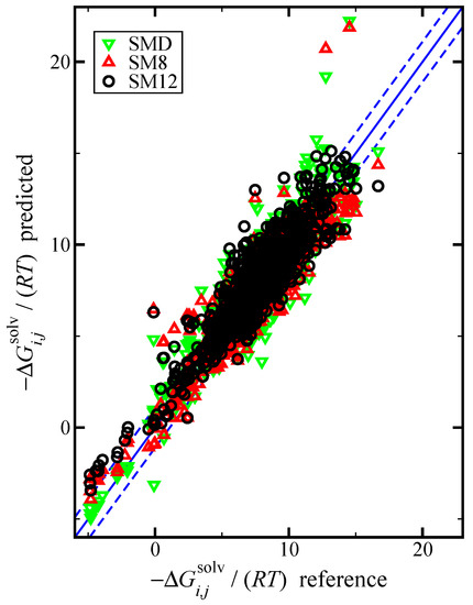 Parity plot of the predicted versus reference values of the negative dimensionless solvation free energy, , using the SM12, SM8, and SMD universal solvent model, as indicated. The blue lines corresponds to the line, and the dashed blue lines correspond to and are drawn as a reference; the value of 1.1 was used based on the RMSE for the SM12 predictions. The reference values are from the Minnesota Solvation Database.