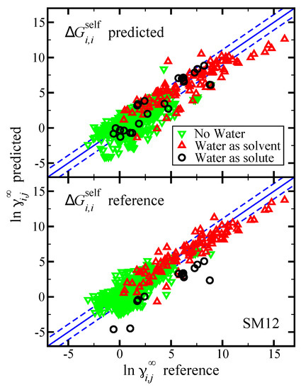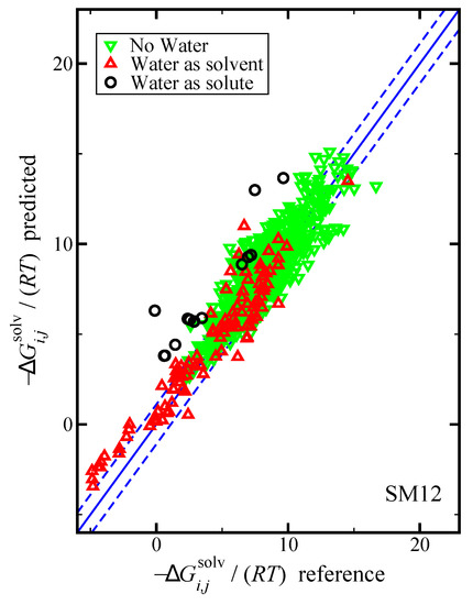 With this in mind, let us again look at the specific case of water. We found earlier that when water is the solute, on average is predicted to be overly negative by 3.4, 3.5, and 2.4 (dimensionless units) when using SM12, SM8, and SMD, respectively. Further, for water is predicted to be overly negative by 3.8, 4.8, and 4.3 (dimensionless units) for SM12, SM8, and SMD, respectively. From Equation (4), this leads to a convenient cancellation of errors in the calculation of . For the case of SM12, using the predicted value of , this would suggest that on average the value of is overly positive by just 0.4. On the other hand, using the reference value of , the corresponding value would be overly negative by 3.4. This is illustrated for SM12 in Figure 5 where the predictions were again broken down to cases where water was the solvent ( water), water was the solute ( water), and when neither the solvent or solute was water.