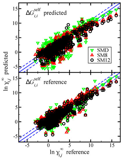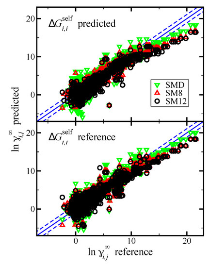 Limiting activity coefficients () were computed for the same 1140 systems from the Minnesota Solvation Database for which was computed. Reference values of were computed via Equation (4) using the reference values of from the Minnesota Solvation Database, the reference values of already described, and reference values of the molar volume [48]. A parity plot of the predicted versus reference values of is provided in Figure 4. In the top pane results are shown when we predict both and , and the bottom pane shows the case when was computed using reference data.