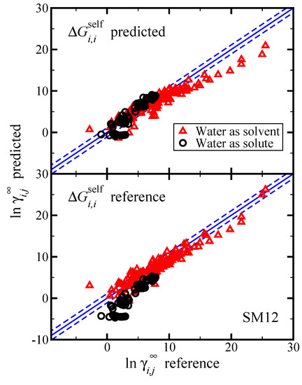 Having identified challenges in predicting for aqueous systems, we sourced an additional data set composed of organics in water and water in organics at 298.15 K from “Yaws’ Handbook of Properties for Aqueous Systems” [56]. Data was available for 121 systems where water is the solvent and 90 systems where water is the solute, with no duplicates. A parity plot of the results for SM12 is provided in Figure 8. In the top pane of Figure 8 results are shown when we predict both and , and the bottom pane shows the case when was computed using reference data. A summary of the statistics is provided in Table 5, broken down into the case where water is the solvent and water is the solute.