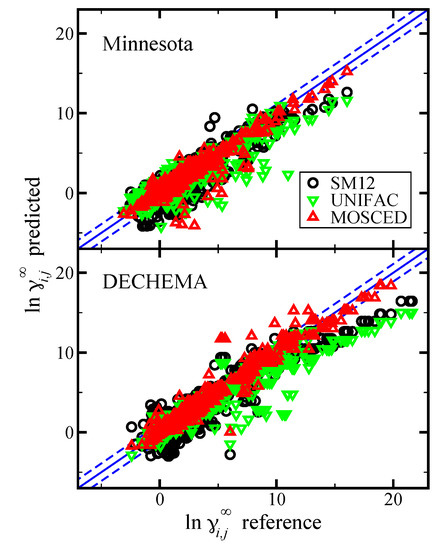 The Minnesota Solvation Database, DECHEMA, and Yaws’ reference databases were constrained to match the compound availability provided by the two models, UNIFAC and MOSCED. In comparison to the Minnesota Solvation Database, UNIFAC was able to make predictions for 1065 (of 1140) systems with 99 unique solutes and 68 unique solvents. MOSCED was able to make predictions for 732 (of 1140) systems from the Minnesota Solvation Database with 58 unique solutes and 54 unique solvents. In regards to DECHEMA, UNIFAC was able to model 1988 (of 2163) systems with 112 unique solutes and 70 unique solvents. MOSCED was able to model 1818 (of 2163) systems with 71 unique solutes and 59 unique solvents. We again note that the DECHEMA data set includes repeated systems. All of the UNIFAC calculations were performed with CHEMCAD 7 [76]. A simple GNU Octave/MATLAB [77,78] M-file to predict limiting activity coefficients using MOSCED, a screen cast tutorial and additional references are available on the YouTube Channel of Andrew Paluch [79].