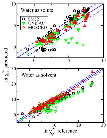 To provide further insight into the potential utility of electronic structure calculations with SMx universal solvent models to predict , the top performing SM12 was compared to two well-known methods, the Universal Quasichemical Functional-group Activity Coefficients (UNIFAC) method [15,16,71] and the Modified Separation of Cohesive Energy Density (MOSCED) model [19,20,72]. UNIFAC was selected as a comparative method because it is perhaps the most common predictive excess Gibbs free energy method [73]. Additionally, it is widely used and integrated into most process simulators. Brouwer and Schuur [73] recently conducted a comparative study of eight predictive methods to compute at 298.15 K. Of the methods evaluated, the solubility parameter method MOSCED was the top performer. This strong performance of MOSCED is consistent with the findings of the 2005 re-parameterization [20,74] and our recent work [8,75]. MOSCED was therefore selected as an additional comparison alongside UNIFAC. Note that for water, we adopted the revised MOSCED parameters from our recent work [75].