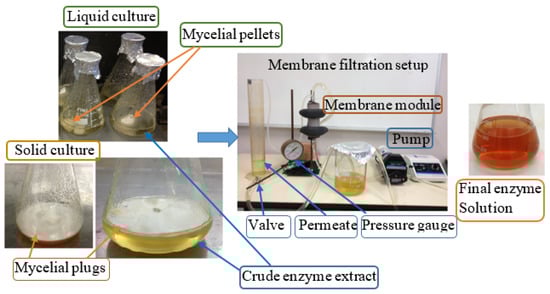 Mycelial pellets and mycelial plugs formation in the liquid and solid culture and the membrane filtration set up to concentrate crude enzyme extract solution.