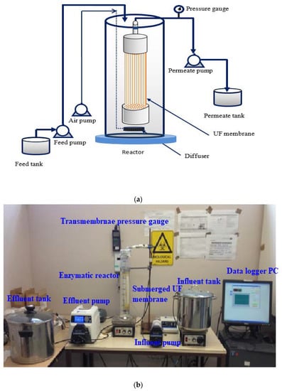 A schematic diagram (a) and a photography of laboratory scale enzymatic membrane reactor (b).