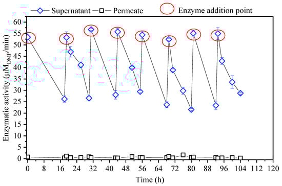 Enzymatic activity in the enzymatic membrane reactor (EMR) supernatant and permeate during the 112 h operation. The data were the average and standard deviation of three measurements.