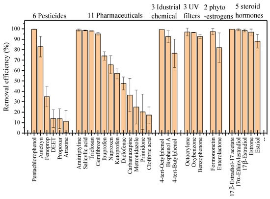 The EMR removed a broad spectrum of emerging contaminants (i.e., 31 compounds and 6 groups). The removal efficiency depended on EC properties (Figure 6). Industrial chemicals, UV filters, phytoestrogens and steroid hormones were effectively removed (i.e., >90%). Meanwhile, the removal of compounds in the pesticide and pharmaceutical groups varied from 10% to above 90% (Figure 6).