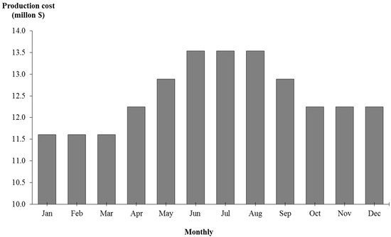 The optimal monthly production rate of each month in a given year is goal of annual optimization where the average moisture content of wood is known for each month and varies seasonally. The pulp demand (D) for each month was specified as 1600 admt/day but could be varied as well. In normal annual production, production cost is calculated by empirical Equation (3) with constant production rates at 48,000 admt/month. The annual production cost is M$150.19, which is related to the moisture content where the maximum production rate is in the months of low moisture content; these results are represented in Figure 4.
