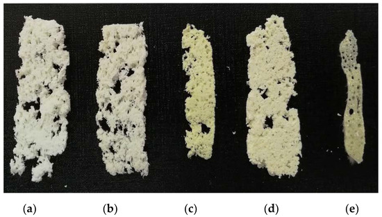 The slices of the obtained porous composite materials: (a) 1/6-70-30; (b) 1/4-70-30; (c) 1/2-70-30; (d) 1/4-50-50; (e) 1/4-90-10.