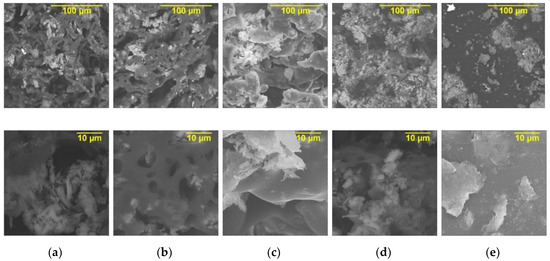 Figure 3 presents microphotographs of the composite samples obtained by scanning electron microscopy (SEM). The filling degree and the conditions for obtaining them significantly affected the porosity of the materials. The composite containing 10 wt.% of PPT (sample 1/4-90-10) had a dense structure with a predominantly closed porosity. When 50 wt.% of the filler was introduced into the polymer matrix, the composite was characterized by a loose structure that could be easily destroyed by the slightest mechanical stress.