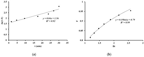 The Boyd model allows the evaluation of the role of diffusion in the sorption process. For this model, development Equation (1) was used [38]: