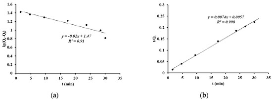 The chemical kinetics models of pseudo-first and pseudo-second orders describe the contribution of chemical reactions to the sorption rate. The correspondence of the sorption processes to the pseudo-first order kinetic model was estimated using the Lagergren Equation (2). Figure 7 shows the kinetics of sorption, according to the pseudo-first (Figure 7a) and the pseudo-second (Figure 7b) order models.