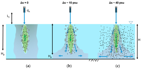 Figure 1c depicts a line of dense plunging jets, similar to the outfall in Figure 1b, except that the ports are located at a fixed elevation above the surface, e.g., connected to a manifold supported by a pier. The plunging jet reactor concept has been in use for several decades, as a means of achieving high mass transfer rates by entraining gas bubbles into a liquid, at low capital and operating costs [22,23,24]. The typical objective is to contact the two phases to promote mass transfer. Plunging jet reactors are widely employed in a variety of processes, such as gas–liquid reactors in the chemical industry, aerobic wastewater treatment, air pollution abatement, froth flotation, and fermentation [25].