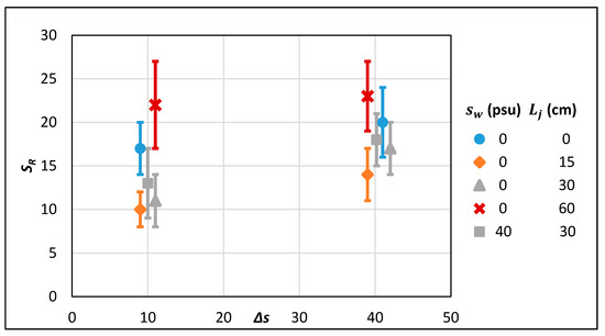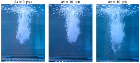 Figure 3 shows snapshots of movies taken of laboratory runs with cm. It can be observed from Figure 3 that small and large bubbles alike are plunged down to the penetration depth. For neutrally buoyant and moderately dense jets (= 0 and 10 psu), the bubbles were observed to plunge to about the same depths (range of 0.18–0.19 m; Table 2), similar to the predicted value of 0.19 m using Equation (3) [25]. However, for brine with = 40 psu, while large bubbles behaved similarly to the neutrally buoyant plunging jet, smaller bubbles were pushed downwards to the bottom of the tank, spreading radially along the tank bottom before rising again up to the surface, resulting in larger and plume widths.