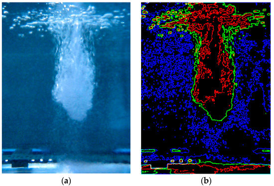 Example of plume width determination using image processing: (a) original image from experimental run ( = 40 psu and = 15 cm); (b) filtered image using the Sobel filter to exaggerate the edges in each color. The width of the bubble plume in this figure was determined as 10.0 cm, and the bubble penetration depth was 25.3 cm.