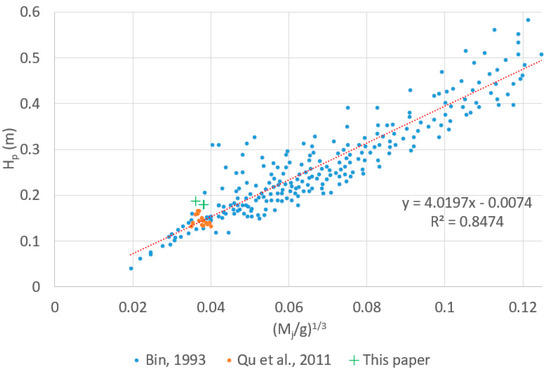 The measurements of in Table 2 are plotted against in Figure 5, and compared with experiments from earlier literature (compiled by [25,33]) for the four experiments for which fine bubbles were not pushed to the bottom of the tank. The experimental data from this study (with ) is observed to be somewhat higher than the fitted curve for . However, there were insufficient experiments with significant variation in the parameter to determine the form of function in Equation (6). Due to large variation, and the relatively small value of for the experiments, our curve fitting was limited to m. From Figure 5, the combined results yield a proportionality constant of , which was used for predictions of using Equation (5).