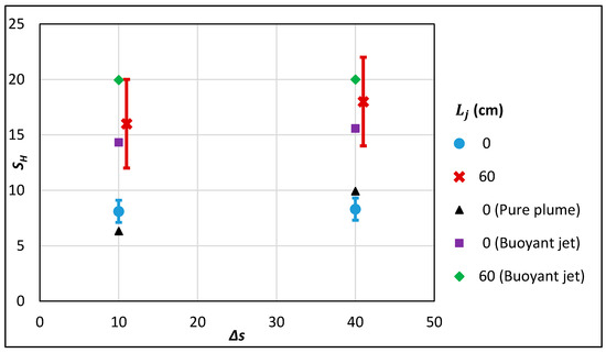 Dilutions measured along the bottom of the tank at R = 0 plotted against . (The abscissas of various measurements are shifted slightly so that all symbols are visible. for all runs plotted.) The pure plume dilution is calculated using Equation (8). The buoyant jet dilutions are calculated using Figure 8.7 from Section 9.2.3 of [40].