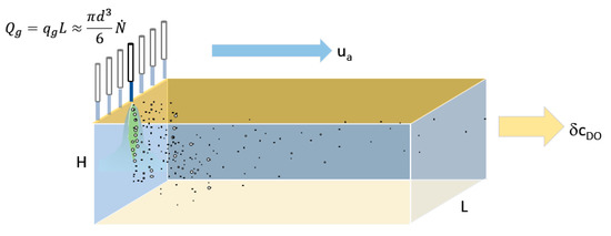 Al Anzi et al. [22] proposed the use of plunging liquid jet reactors, arranged in a diffuser array, to promote the aeration of the underlying water via entrainment of air bubbles from above the water surface. In this section, results from the current study are used to estimate the amount of aeration achievable with the bubbles entrained by plunging brine jets that are in contact with a moving water column. Consider the scenario in Figure 8, where a jet array of length comprising jets discharges vertically downward into a water column of depth where the ambient current is . As the jets penetrate the water surface, they collectively entrain oxygen from the atmosphere into the water column at an oxygen flux rate of , where is the gas flowrate per unit length of the jet array.
