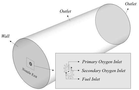 The numerical simulation domain of the supersonic coherent jet is shown in Figure 2, which contains 3 million computational cells totally. Total computational time is around 15 h if using 80 cores in the High Performance Computing (HPC) cluster to obtain the converged results. The simulation domain is a cylindrical-shaped vessel originating from the exit of the converging-diverging nozzle where the nozzle structure is ignored. The dimension of the vessel is much larger than the burner, which can be used to simulate the supersonic coherent jet behavior in the open space. Therefore, except for the wall where the nozzle exit is located, the other walls of the vessel are set as outlets. More detail on burner operating conditions and other information are mentioned in another published paper [20].