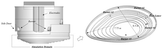 Once the constant is determined by solving Equations (13) to (17), the theoretical parabolic jet cavity interface can be defined and included as the physical boundary for the computational domain of the bottom section of the EAF for the decarburization simulation. This eliminates the need to include the consideration of supersonic jets and its interaction with the liquid surface in the decarburization simulation. The estimation of the three-dimensional jet penetration cavity based on actual burner operating conditions is illustrated in Figure 3 and the computational domain with five jet penetration cavities established according to the actual burner arrangement provided by industry is given in Figure 4. This computational domain is going to be used in subsequent decarburization simulations.