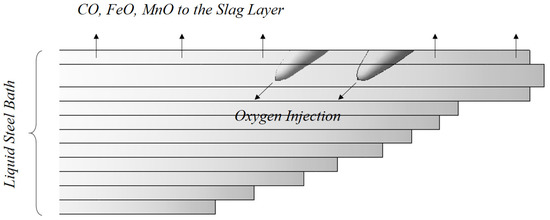 where and is the mass of liquid steel and the volume of oxygen in the corresponding cell, respectively; is the mole mass of each substance; is the efficiency factor of each substance, which is a function of total mixing of the system and can be estimated based on the work done by Shukla et al. [25]; is the oxygen distribution ratios of each substance and is assumed to be proportional to the Gibbs free energies of corresponding oxidation reactions: