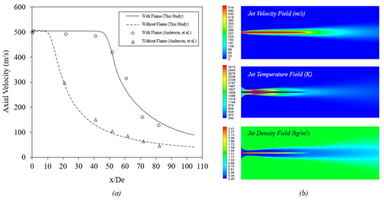 (a) Jet axial velocity distribution with & without shrouding flame; (b) Velocity, temperature, density field distribution of the supersonic coherent jet.