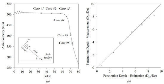 (a) Different nozzle-liquid surface distance for specific burner configuration; (b) Parity plot of penetration depth inside liquid steel bath.