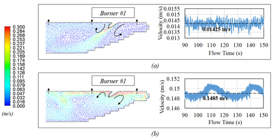 The comparison of the flow filed with and without the bubble stirring is given in Figure 8. Figure 8a shows the case only considering the momentum stirring. It can be seen that the high momentum transferred from the surface of the jet penetration cavity pushes the liquid steel downward, resulting in a high-speed liquid steel flow in the axial direction of the cavity together with vortexes generated on both sides. The volume-averaged liquid steel velocity in the bath fluctuates most frequently around a value of 0.01425 m/s. Figure 8b shows the case considering both the momentum stirring and the bubble stirring. Because of the bubble stirring, the high-velocity region occurs surrounding the jet penetration cavity instead and the direction of the vortex changes significantly. This is mainly due to the intensive oxidation reactions in that region generating a large number of oxides and the stirring intensity of the momentum transfer became much weaker compared to that of the floating CO and oxygen bubbles. In addition, significant turbulence is generated through bubble stirring in the liquid steel bath as well, which can lead to a better mixing. The volume-averaged velocity of the liquid steel bath is approximately 0.1485 m/s, which is about 10 times as much as the case only considering the momentum stirring. From this comparison, it can be seen that bubble stirring greatly promotes the homogenization of the liquid steel bath and is one of the most important stirring mechanism in the EAF refining stage.