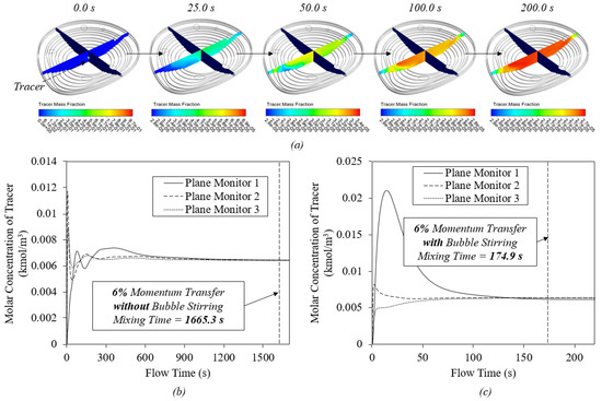 The bath mixing efficiency evaluation for both cases was conducted as well and the results are given in Figure 9. A tracer is introduced in the center of the liquid steel bath and the simulations stop once the tracer is fully diffused inside the bath. During the simulation, the area-averaged concentration of the tracer is monitored at three different horizontal planes in the bath to evaluate the mixing time. The vertical distance between those three horizontal planes and the bottom of the furnace is 0.07 m (plane monitor 1), 0.47 m (plane monitor 2) and 0.57 m (plane monitor 3), respectively. Noticed that, plane monitor 1 is close to the furnace bottom surface, which is aimed to avoid the dead zone and guarantee the full diffusion of the tracer in the domain. Figure 9a shows the contours of the in-bath tracer mass fraction variation over time. Figure 9b,c show the molar concentration variation of the tracer over time. When the variation in the molar concentration of the tracer is negligible, the mixing time required for the liquid steel bath to reach full diffusion can be obtained. It can be seen that without the bubble stirring, the mixing time is estimated to be 1665.3 s, which is almost 9.5 times longer than the time needed for the case with the bubble stirring. Therefore, the bubble stirring needs to be considered in the stirring mechanism for the future simulation of the liquid steel flow field.