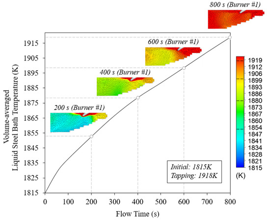 Generally, the average carbon content and the bath temperature are two important indicators for the operators to decide whether liquid steel meets the requirement of tapping. The volume-averaged carbon mass fraction and bath temperature predicted by this 3D integrated model are plotted in Figure 10 and Figure 11. From the simulation results, after 800 s (around 13 min), the bath temperature will be increased to 1918 K with carbon content reduced to 0.056%. The percentage of carbon reduction and bath temperature increasing is 86.3% and 5.7% respectively. It is reported that the time required to reach the same carbon content and bath temperature during the actual refining process is about 12 to 15 min and current results give a correct prediction by comparing with the data published in the reference [31].